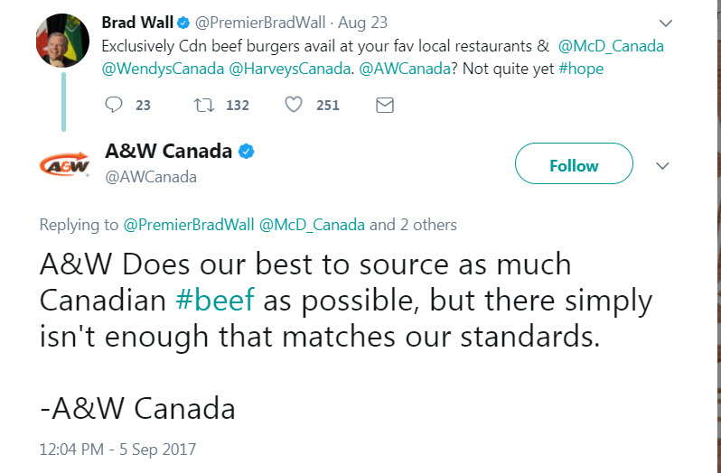 Twitter Battle: Brad Wall calls out A&W on claims regarding Canadian Beef quality.