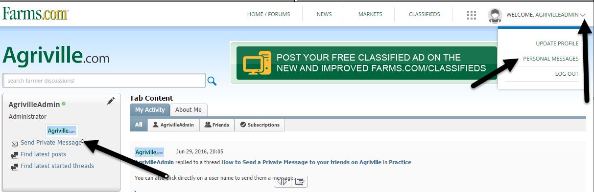 we've set up private messaging on Agriville. Click on your username >> Personal Messages.