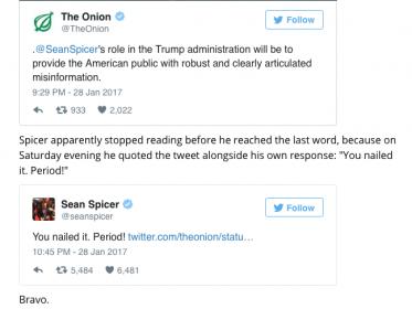 Here Spicer congratulates the Onion for a tweet it made, clearly without having read or understood the words used and knowing the Onion is a satirical site. Must be comforting for Trump surrounding himself with other fellow intellectuals.