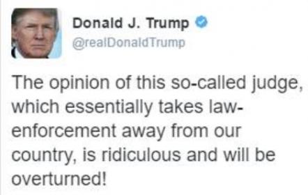 "The opinion of this so-called judge, which essentially takes law-enforcement away from our country, is ridiculous and will be overturned!"