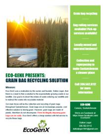 Hey guys. I just wanted to post on here to let you guys know of Eco-GenX and what we are doing. Eco-GenX is a new company designed and created by Dallon Leger and will be located in Canora, Saskatchewan. Our main focus is to divert waste from our landfills and offer proper recycling for our agriculture producers in Saskatchewan. The intent of our business Is to recycle a non-biodegradable material that is detrimental to the well being of the enviroment, provide a service to farmers – thus eliminating the hassle and stress of discarding plastic - and to generate awareness and educate a large number of people to keep Saskatchewan a cleaner, more beautiful place. I have attached our flyer which gives our contact information and a little bit more about what we are doing. Please don't hesitate to contact me for any questions or to arrange a pick up. Thank you!