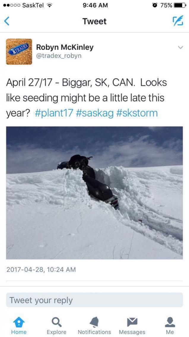 Thats going to put us 2-3 weeks behind normal. Not that i'm complaining... at least we were tremendously fortunate to get the crop off here by remembrance day. A record i hope to never outdo! Further north of here the stories are almost unbelievable. A friend hauls equipment in east central ab, and has talked to a few guys with water logged or snow covered fields with up to 75% of their acreage still sitting out. Neighbors in-laws have 1/3 still out, with many of their neighbors in the same boat to upwards of 50%+. They figure 10 days to 2 weeks before the fields will even hold up a combine let alone see a drill!