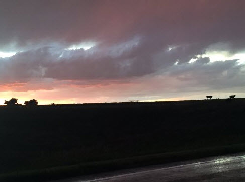 Day 6 Jun 29, 17 #cornbelt17 N Hwy 283 Solomon District-3, KS - sun setting with combines & cattle in the distance