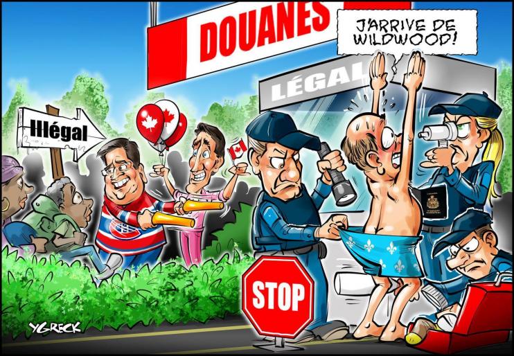 But the funniest part is like the photo. Cross the border back into canada and you feel like the poor schmuck drawn in the cartoon. They ask every question on earth worry about every dime you spent and what your bringing back yet others just cross over and get a free pass. Like JT wants the public to believe.