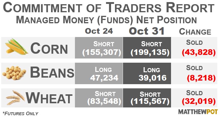 Agree with both Eroll and Agvoacate. I cant see any big change in wheat or corn positions in the near futures. But I agree that soybeans could be the most vulnerable the longs exiting.