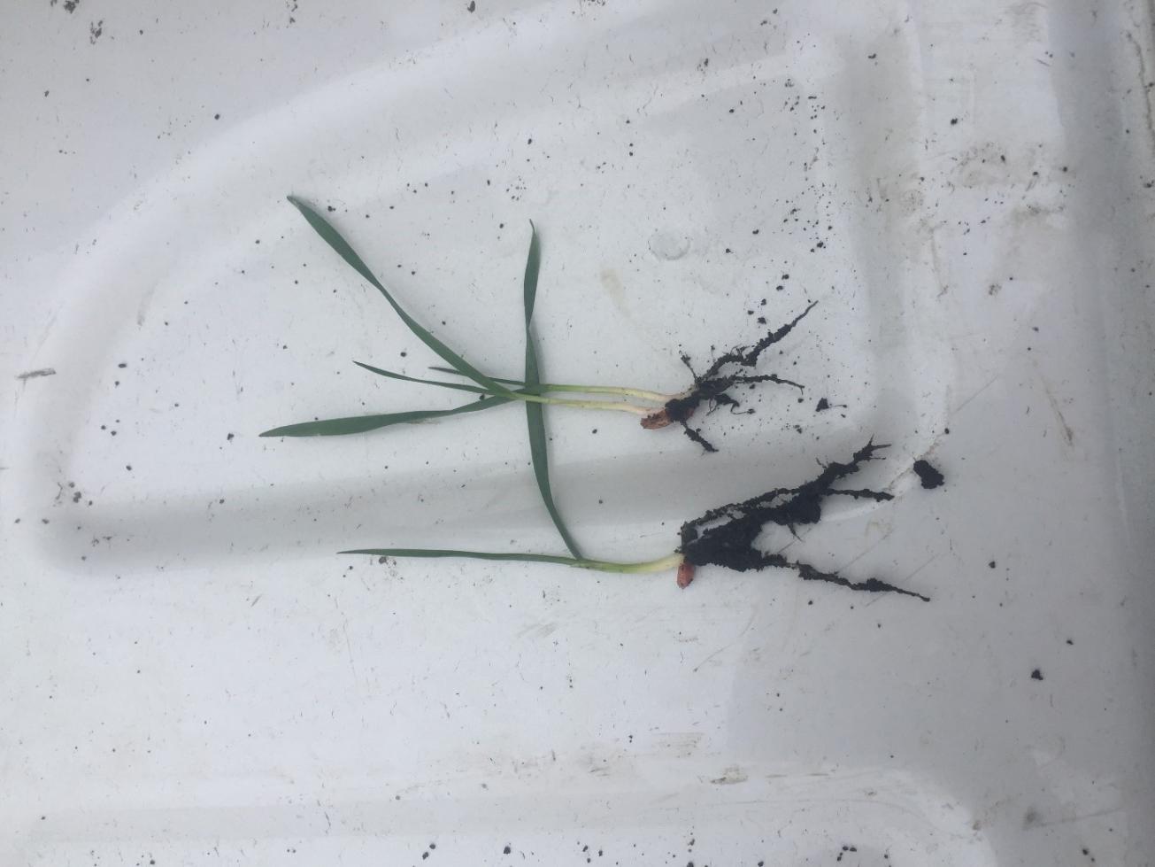 Winter wheat seedling plants of side by side seeding. The CX-6 Smart Seederâ„¢ seedling (shown on the bottom)