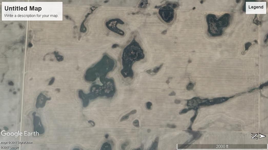 Fj....some are now disced after the drought conditions this summer. The biggest ones might be hard to drain. Trenches would be as bad if not worse than the slough. "Average years" ...the big ones would always have some water....just the way it is . Small ones...variable. Remember, imagery is 2012....pretty wet.Originally posted by fjlip View PostCan those potholes be "legally" Drained? Or are they dry now?