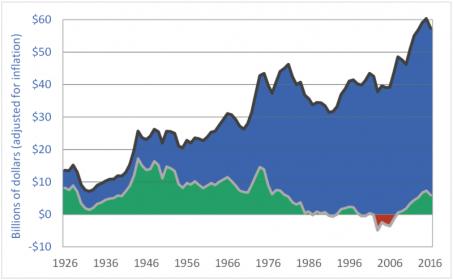 The green-shaded area highlights periods of positive net farm income; the red-shaded area marks negative net income periods. Most important, however, is the area shaded blue—the area between the gross revenue and net income lines. That area represents farmers’ expenses: the amounts they pay to input manufacturers (Monsanto, Agrium, Deere, Shell, etc.) and service providers (banks, accountants, etc.). Note how the blue area has expanded over time to consume almost all of farmers’ revenues, forcing Canadian net farm income lower and lower.