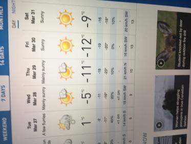 I would be willing to bet this is one of the coldest winters in our history .Check out the nightime -20 temps for end of March . I know , its just weather , but recently in Toronto they were spouting about the proof of global warming after 4 above average warm daysTags: None
