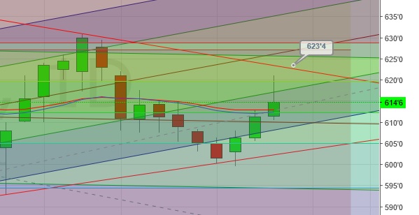 MWN up yesterday and again this morning. the present price of 610.25 puts it right on the median line of the fork pattern mentioned above. A good place to finish today. See if it holds