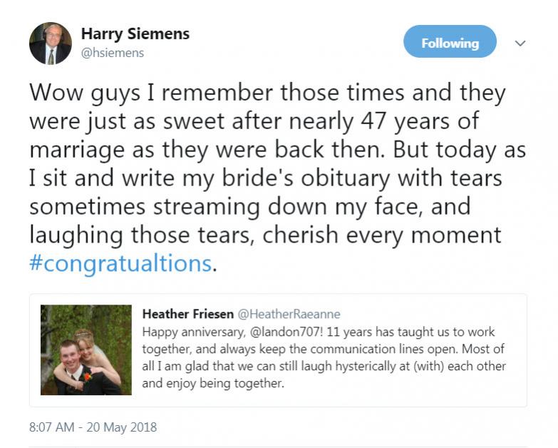 Sad news: Judith Elizabeth Siemens (nee Froese) 1945 - 2018, Beloved wife of Harry.