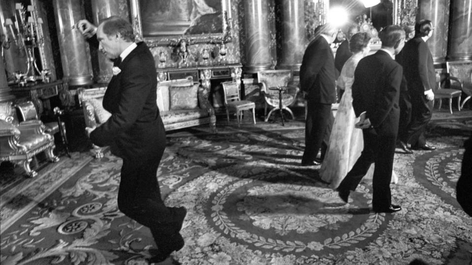 sees a man walking in a straight line and a little old woman walking in a disorganized gate behind,along side,in front of the man during a ceremony designed to convince a population to give their tax money to keep the old woman in fancy hats(deep breath)...then sees the man as the problem.