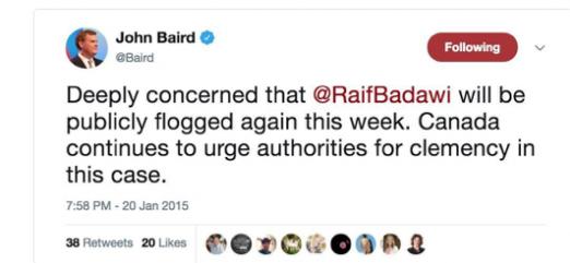 Baird's tweet from 2015 when he was a Government minister - condemning the Saudis for their miss-treatment of the same person