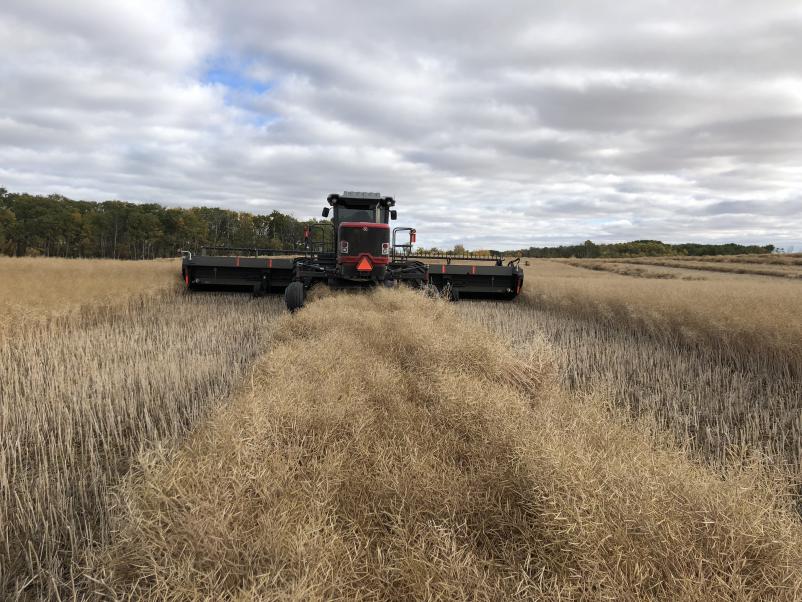Canola harvest is starting with guys Straight cutting but leaving patches as it's not really ready field wide. Swath guys are needing 14 days to get to being dry. Winds have moved very little in swaths yet. Some days the last week were wind speeds of up to 60 km, minor damage. Lots of guys who were Straight cut last year Brought the swather back and still do a portion swath. Good promotion but the reality is its tough to sit on the sidelines on a great harvest day when everyone else is combining. Yield 35 to 62 for our area so far or Average to slightly lower for some. Our last fields of Pod shatter were swath this week. They are used on our farm to help us keep ahead and damage control if we get behind swathing. The last field swath was hail damaged and did have regrowth. The first plants did hold there pods intact with min shatter. On our farm, its buy the swather and maybe if the RR spraying thing in fall does happen to buy a few more swathers. THey won't let you spray liberty or RR canola in fall if we cant spray HRS.