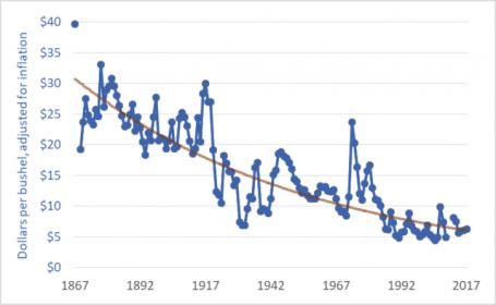 It is noteworthy that he managed to curve fit the inflation adjusted wheat price with what appears to be exponential decay. Indicating that the decline in the buying power of wheat is getting slower, and appears to be approaching zero, ie. it is keeping pace with inflation better than ever in the 150 year history used in the graph, and may equal inflation soon if the trend continues. As a producer, I'm not sure why that should be constitute a crisis? As a consumer though, I would be wondering where this is headed, and what my food will cost in the future, wouldn't it indicate that farmers abilities to increase production and lower costs are eroding?