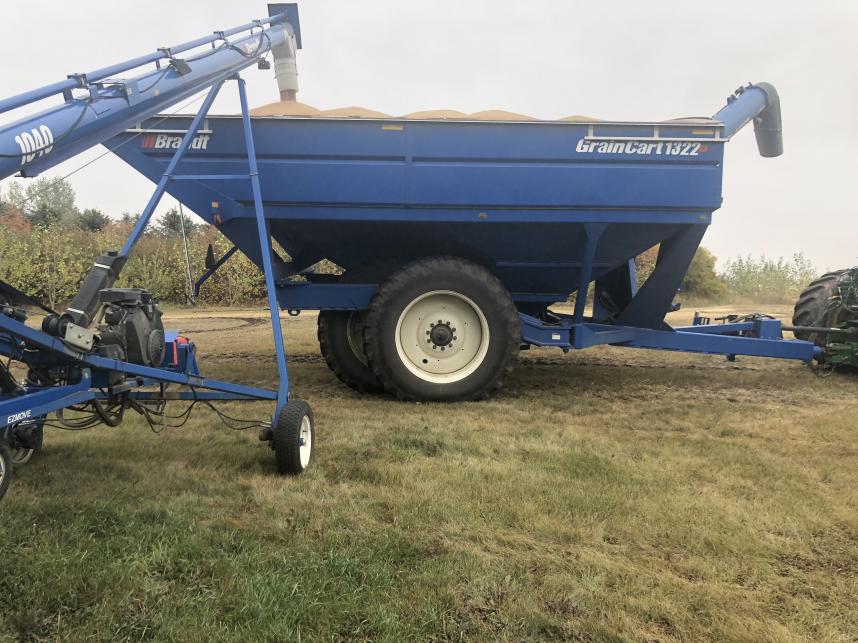 We use swingaway auger to dump 13 in and bigger tractor for tough grain.
