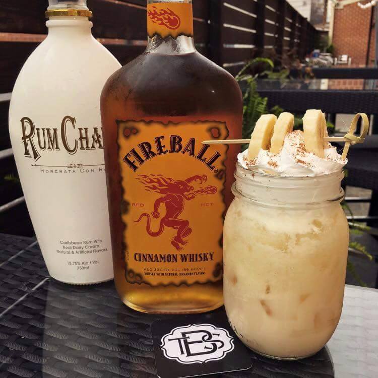 Fireball Cinnamon Whisky, RumChata, a splash of half & half shaken then topped off with club soda and banana slices.