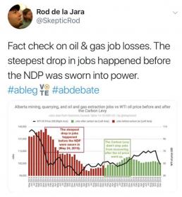 Here is a little reality check ahead of the upcoming AB election. Not that it will change much as Albertans tend to operate on an ideology is fixed, facts are negotiable basis. (Red jobs under PCs, green are jobs under NDP - black line in WTI oil price.