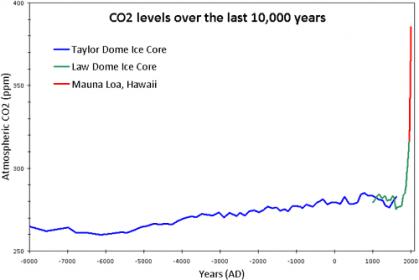 Figure 1: CO2 levels (parts per million) over the past 10,000 years. Blue line from Taylor Dome ice cores (NOAA). Green line from Law Dome ice core (CDIAC). Red line from direct measurements at Mauna Loa, Hawaii (NOAA).