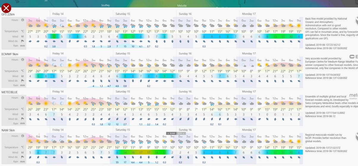 Here are 4 major weather models for 3 days out. That's as close as a forecast as you are going to get. None of them agree with each other. Some have opposite wind directions. Some of the temps disagree by 3 or 4 degrees.