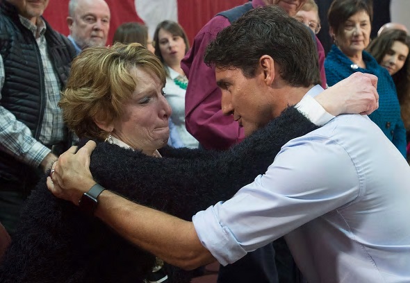 None of the posted photos show a woman who looks uncomfortable with the situation they're in. The lady crying is obviously emotional but I'm doubtful it's due to Trudeau touching her... The photos need context. Many people touch each other in support and friendship, it has been part of being human for thousands of years, physical touch. People can't bemoan the fact that children now a days can't make eye contact or relate to others without doing it through their phones and then we spew stuff about not being able to generically touch someone on their arm without it being "Manhandling".