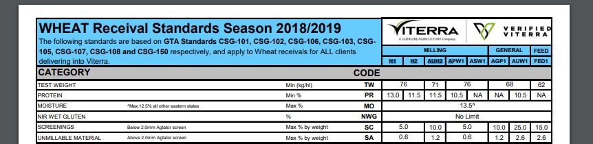 Wheat our standard is APW 10.5 to 11.5% protein. Usually about a 15 spread between grades, except for AUH2 often no premium above apw but blended by buyers thats there perogative nowadays they openly admit to it.