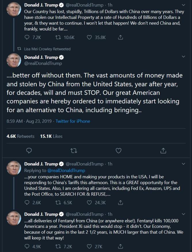 He has no idea what he’s talking about many people say it’s the USA that has the trade benefit instead of China. When they booted Evanka and her shitty clothes line out that may be what the entire world is paying for.