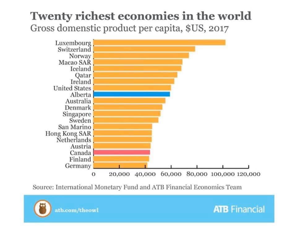 Talk about shooting yourself in the foot! Posters on this site repeated claim how bad Albertans have it and how Albertans are being ripped off by Eastern Canada, yet I guarantee any Easterner that views this graphic will immediately see Albertan as simply greedy whinners. After all, the graphic shows the GDP/Capita in Alberta is much higher than Canada's. This graphic does more to hurt western Canada then help solve real issues out west!Originally posted by fjlip View PostGDP of 20 richest countries...Guess Who in middle?[ATTACH]5160[/ATTACH]