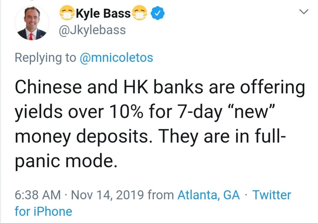The push higher in US equities along with Bass's tweet says China and Hong Kong is bleeding capital at an astronomical rate, people are worried it will be seized or unavailable, its flying out of there and so China has to offer higher rates to attract investment for short term BONDS!!! Banks are the govts bitch as far as selling debt. This ties into the repo issues as banks also won't invest in China, (thank god our pension money will, sarc). Hong Kong is a massive financial market in Asia, don't have the numbers on the top of my head. If/ when the civil unrest boils to the point China goes full dictator, it's the end as far "Canada being in it for the long haul". The risks are magnifying here as far as commodity prices. We could be looking at the final push of deflation relatively short term speaking. I highly recommend reading the above hotlinked thread. There was a significant amount of time resources spent on it.Last edited by macdon02; Nov 14, 2019, 23:59.