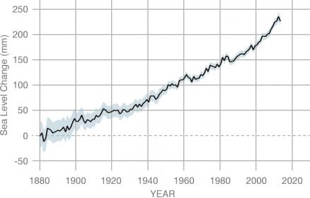 "Global sea level has been rising over the past century, and the rate has increased in recent decades. In 2014, global sea level was 2.6 inches above the 1993 average—the highest annual average in the satellite record (1993-present). Sea level continues to rise at a rate of about one-eighth of an inch per year.