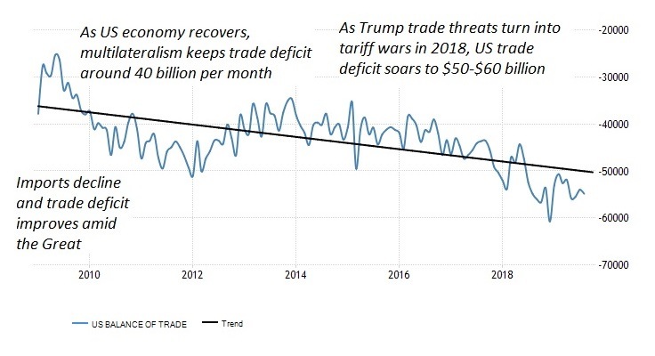All credible sources I find say the trade deficit has increased under Trump. For example: https://www.fxstreet.com/analysis/how-trump-tariff-wars-worsen-us-trade-deficit-201910311352 https://www.fxstreet.com/analysis/how-trump-tariff-wars-worsen-us-trade-deficit-201910311352