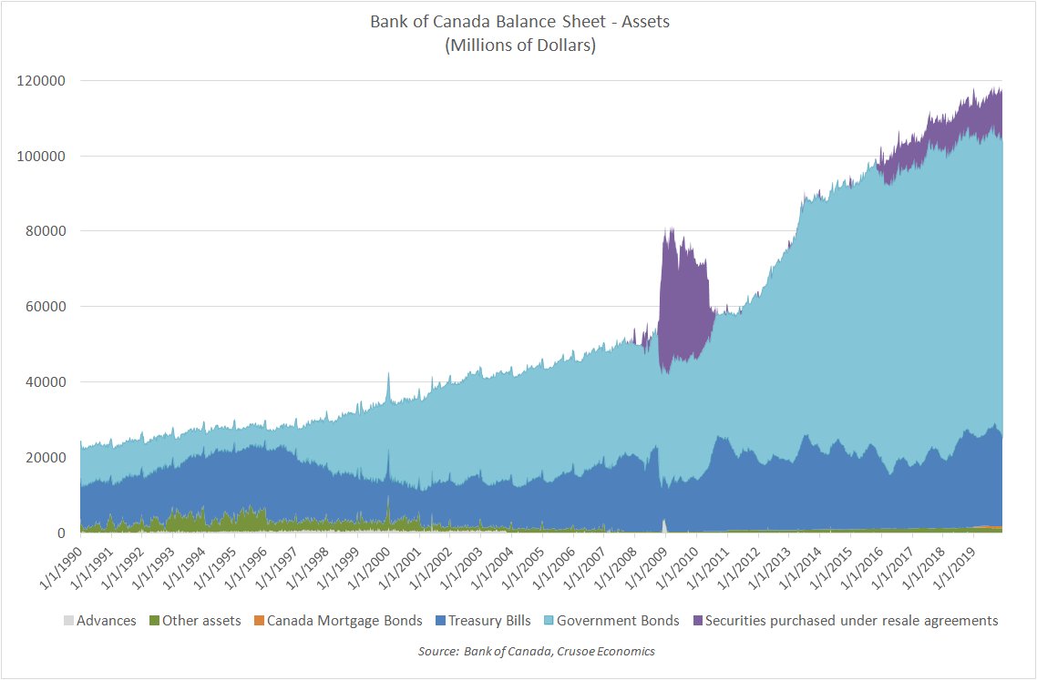 Here is the bank of Canadas balance sheet. You can see the huge run up in the balance sheet at the end of harpers term and ramped up under skippy. But if you look very closely you can see Canadas own QE program started last year. BoC buying 5 and 10 year mortgage bonds for the first time ever to flatten the yield curve and induce more lending growth.