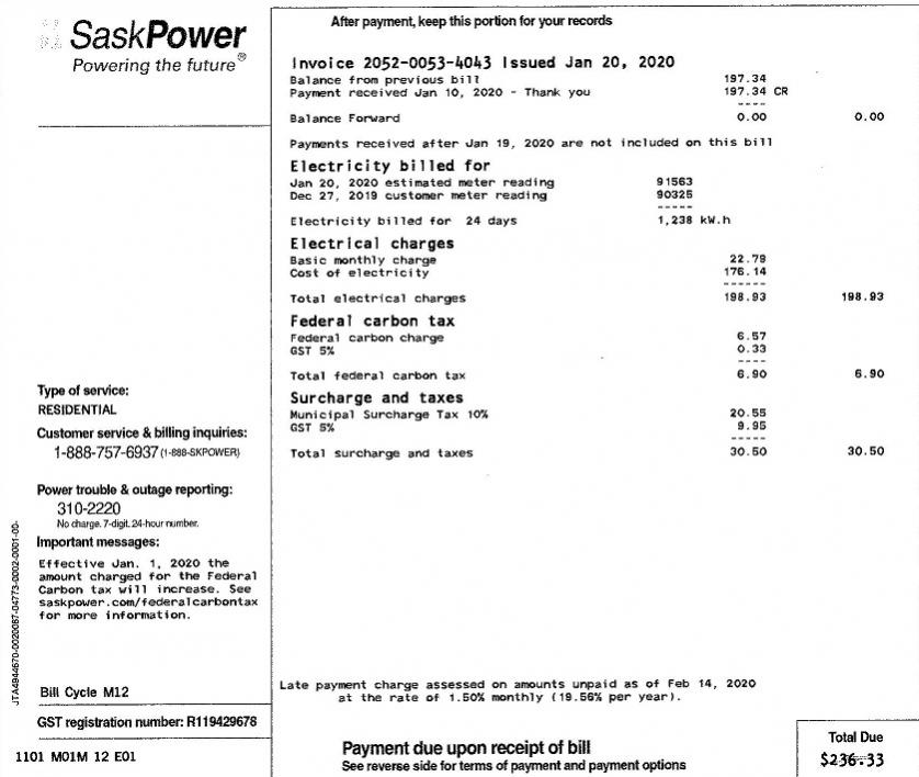 And carbon tax going unfairly against our cleanest fuel source, nat gas. Bills are similar value (power bill high due to a meter read error), but the comparison is there. $7 carbon tax on electricity, $27 on gas. Sask still gets most of its electricity from coal I think, some hydro.