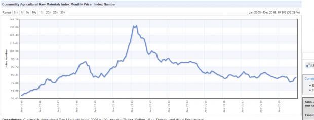 He also had a chart of the top producers (long term solid farms) in the presentation and the trend of the curve was exactly the same, only a bit taller bars. It's unlikely grain prices will rise, if anything, go the other way. A chart of raw agricultural since farming is more then just grain. However, the ratio does not follow the price. So its obvious it's the denominator that's the issue.