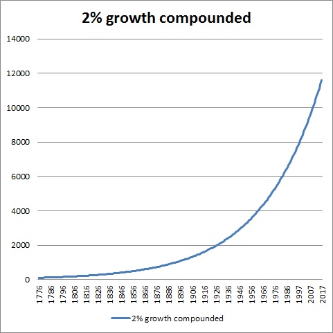 Here is what 2% compounded since US independence looks like. 1776 being 100. Some of that growth was the result of resources brought in from outside its borders. How is that accounted for? Ask an accountant? I think it's on the ledger somewhere.