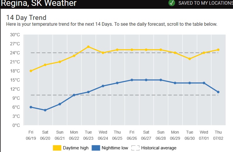Which does cast some doubt on the veracity of the rest of the numbers. Although East of Red Deer has a frost warning tonight. We do to, forecast of +2. Record low today is -3 in 2016 here.Last edited by AlbertaFarmer5; Jun 19, 2020, 00:20.