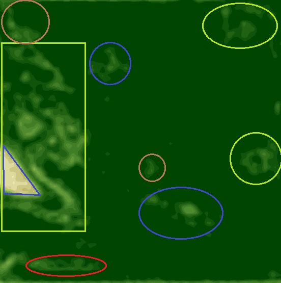 (Blue - water bodies or drown outs; Green - trees grass low areas and salinity; Brown - salinity or lighter soils)