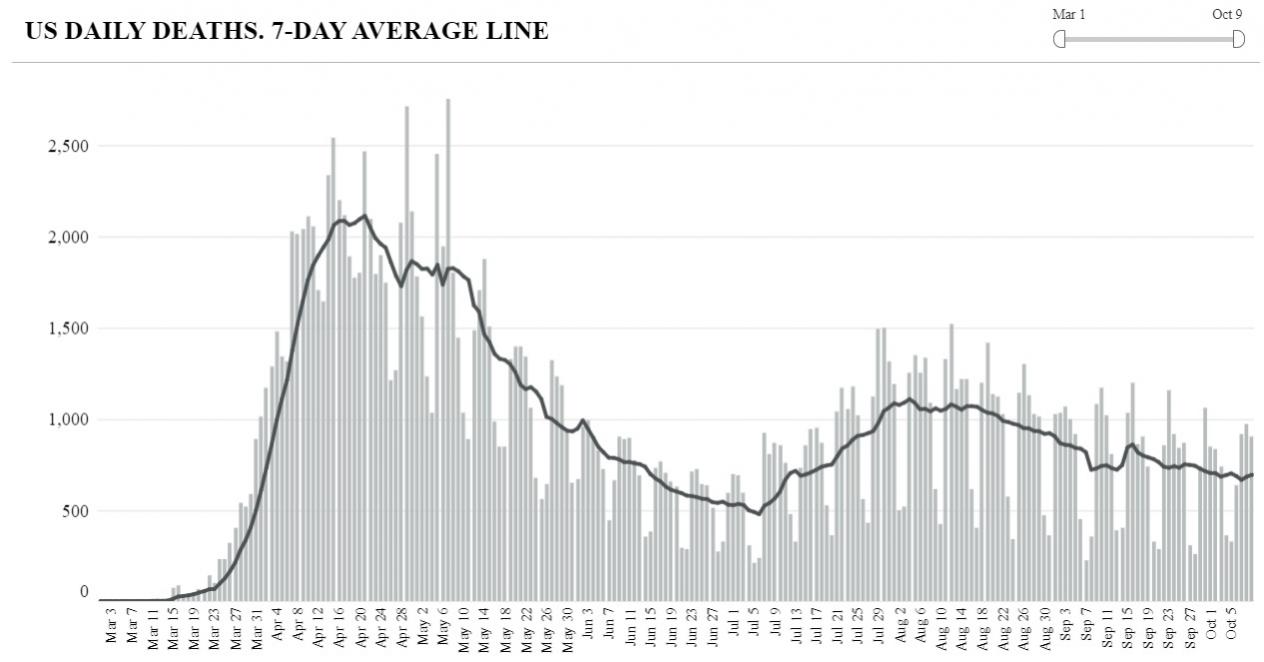 Consider this. Roughly 213,000 have died from Covid in the US since beginning of March, 2020. That is about 225 days ago, so an average of about 950 people have died in the US each day.