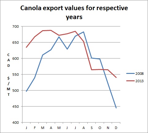 Canola values were very good for much of 2012 as well because of the lower yields expected that year and world oilseed demand/shortage