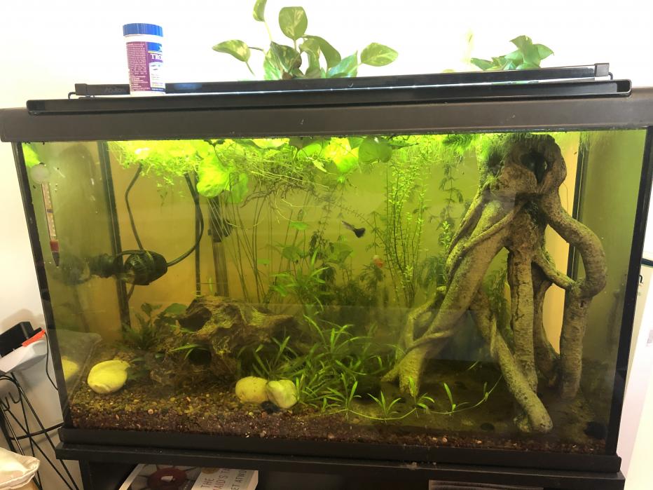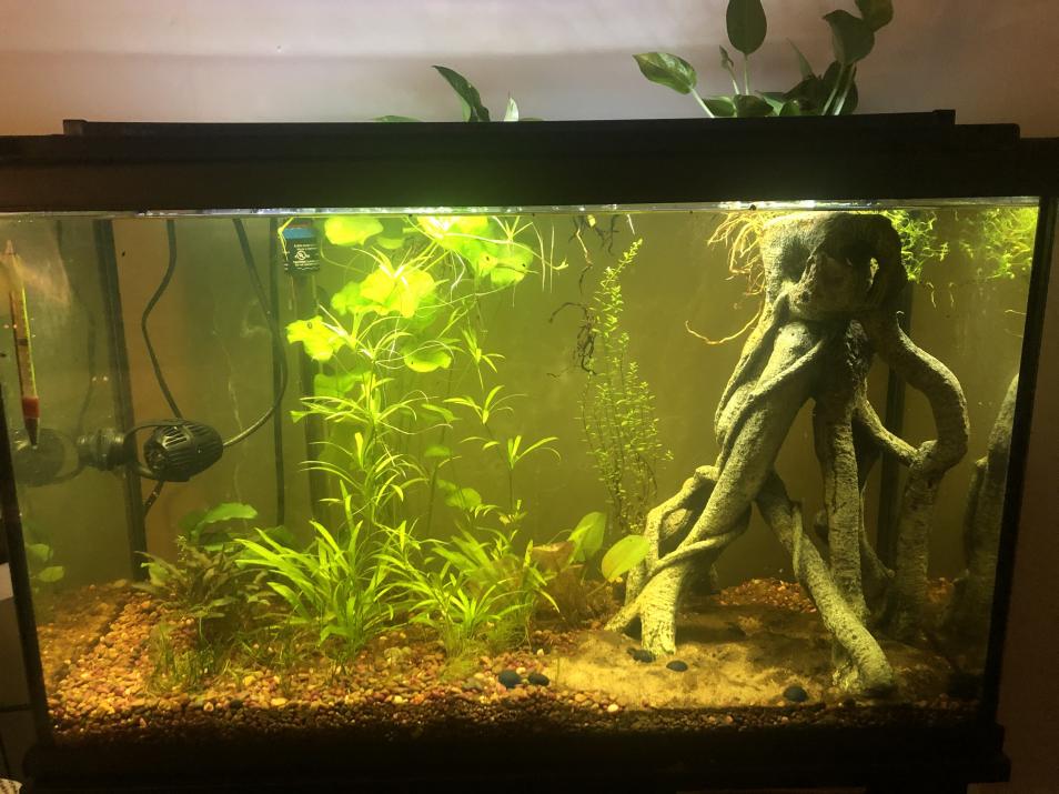 The main goals with planted tanks is to get it working together as it's own little ecosystem. This is called "cycling", you want the tank to cycle. Mainly this is focusing on the Nitrogen cycle. The soil and decaying matter (and eventually any livestock) produce ammonia which then turns to nitrite and on to nitrate yada yada we ag peeps know this. Well ammonia kills flora and nitrite kills flora, and in very small amounts, while nitrate is also toxic but can be handled by fish and invertebrates in higher levels. This is going to be a very simplified summation but more or less, you put soil in the tank, you put water in the tank, you put plants in the tank, your tank starts to cycle. Nitrifying bacteria are going to start to develop and you will probably see a bacterial bloom. Nitrifying bacteria are helping convert the ammonia to nitrite and then to nitrate. In a non planted tank this is accomplished with filters full of bacteria and regular water changes to keep levels safe for livestock. However, do you know what else absolutely loves ammonia and nitrite and nitrate? Bet you do.