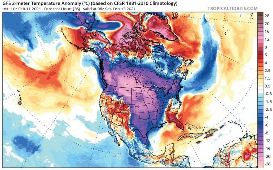 This map shows forecasted temperature anomalies across North America for Saturday, Feb. 13. A large portion of central North America was under a dome of extremely cold arctic air that was displaced southward. The coldest temperatures, running from 12 to 18 C below average, were found across Western Canada and the northern U.S. Photo: tropicaltidbits.com
