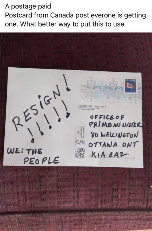 Received a blank post card from Canada Post with a postage stamp. The instructions said to send someone a short note and it can go a long way. So i sent mine to Justine Trudeau at 80 Wellington St Ottawa Ont. K1A0A2.