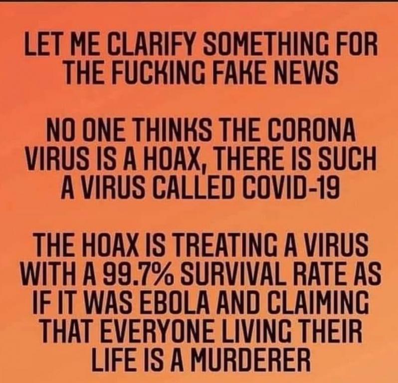 How about..."The "health officials" are in panic mode. They know this is a seasonal virus that will soon disappear, so they're ramping up testing, harvesting cases in hospitals and padding death counts. They are definitely not in this with us. The "health officials" are in panic mode. They know this is a seasonal virus that will soon disappear, so they're ramping up testing, harvesting cases in hospitals and padding death counts. They are definitely not in this with us.Last edited by fjlip; Mar 28, 2021, 19:23.