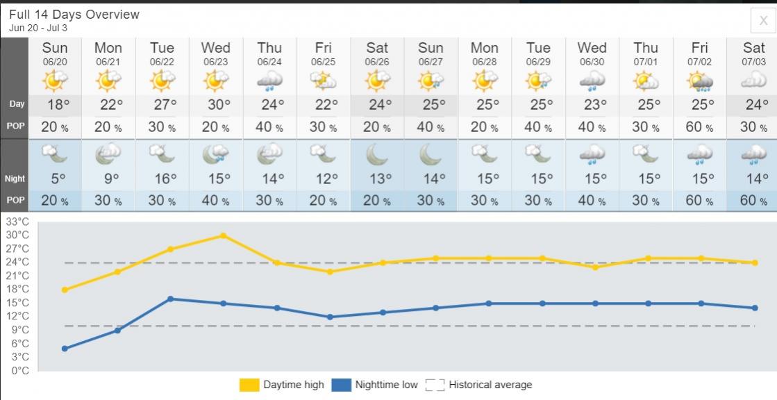 Well below 30 deg temps into the next 2 weeks which have typically been the hottest parts of the summer. Even the woke network shows our temps right in historical averages. Chance of frost sunday night. Thats a real nice touch now that the crop is stretching out.