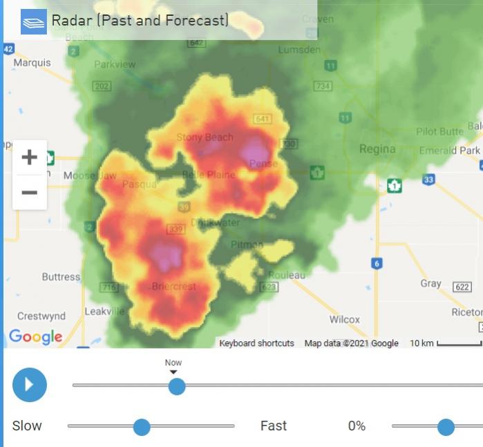 Pretty much dry at Landis to Biggar but heavy dark clouds north of Biggar.