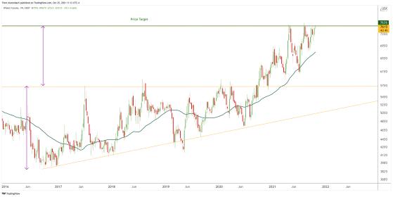 The saucer that has been developing since 2012 is textbook perfect. The measured move higher is tied to how long it took to build the base, significantly higher in this case.