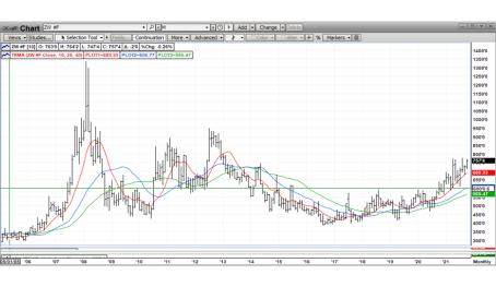 This gives another perspective. It's the continuous monthly chart for Chicago Wheat.