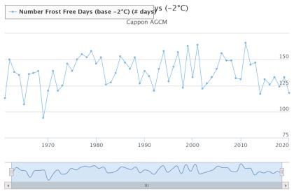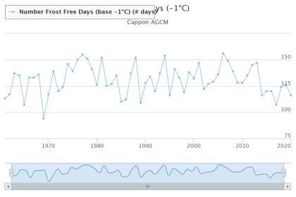 But these graphs show perhaps a slight increase of yearly mean temp, but not necessarily much in the way of an increase for growing season mean temp, or growing degree days.