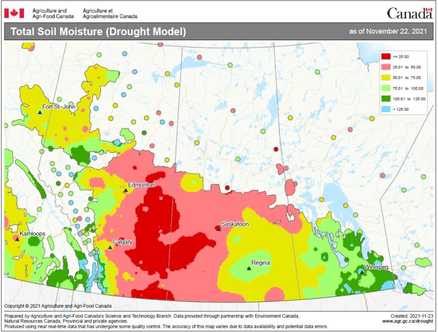 Most of the red area is actually close to long term normal, whereas our area out west was a healthy green on the total soil moisture map, but on the 2nd map, we are amongst the driest in the prairies compared to normal. Which isn't neccesarily a bad thing going into spring around here.