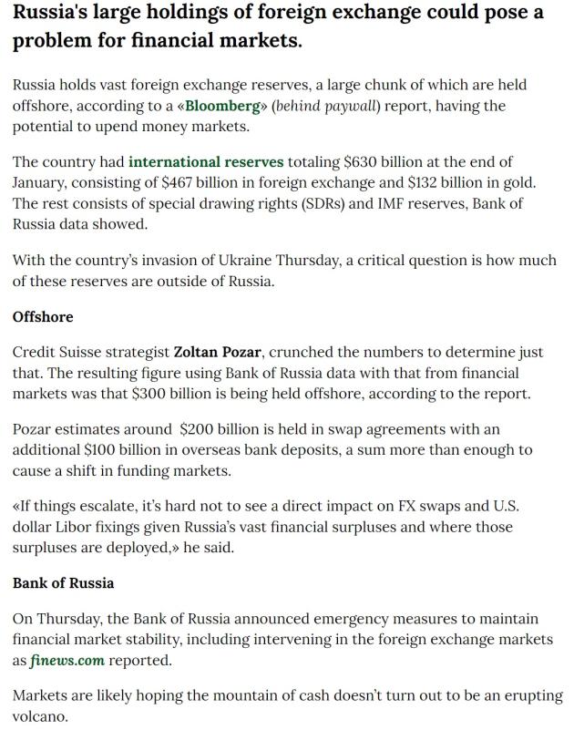 Russian commercial banks are now out of Euro|US$… has been a huge run on currency as Russians try to convert Rubbles to ‘any other currency’.Originally posted by jazz View PostGezus did Putin play the system. They might freeze him out of swift but Russias offshore assets are being used for liquidity for the money markets including the ECB. Russia has been propping the insolvent ECB.